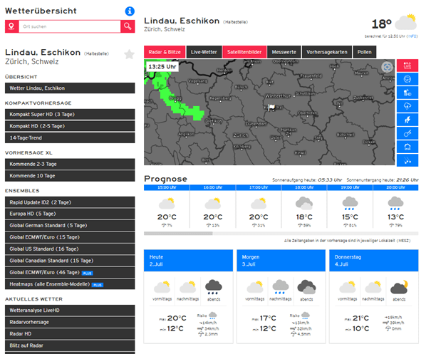 Abb. 9: Die exemplarische PC-Ansicht einer Wetterplattform zeigt das Wetter am 02.07.2024, 13:00 für Strickhof Lindau, Eschikon. Im linken Bereich können der Vorhersagezeitraum und die Wettermodelle ausgewählt werden. (© Screenshot Kachelmann Wetter)