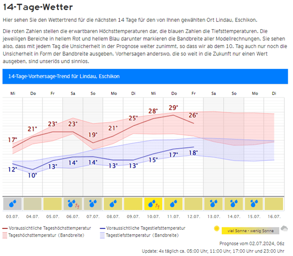 Abb. 10: Die exemplarische Ansicht einer 14-Tage-Prognose zeigt voraussichtliche Temperaturen, Niederschläge und Sonnenschein ab 03.07.2024 für Strickhof Lindau, Eschikon. (© Screenshot Kachelmann Wetter)