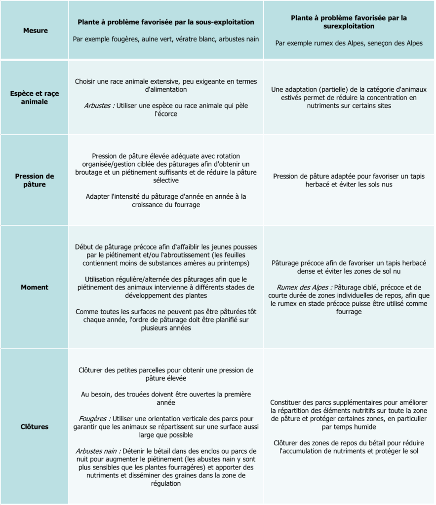 Selon que les plantes à problèmes présentes sont favorisées par une sous-exploitation ou une surexploitation, le pâturage doit être orienté différemment.