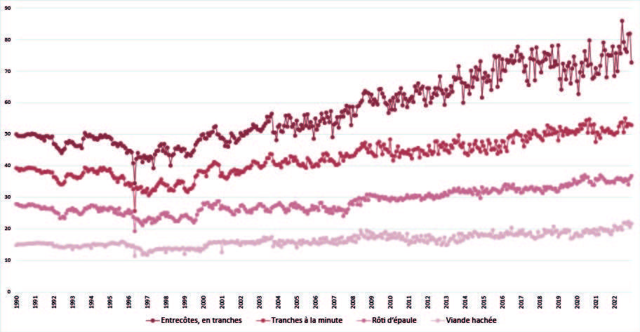 Figure 6 : évolution du prix de vente consommateur de différents morceaux de viande de bœuf (sans os, CHF par kg)