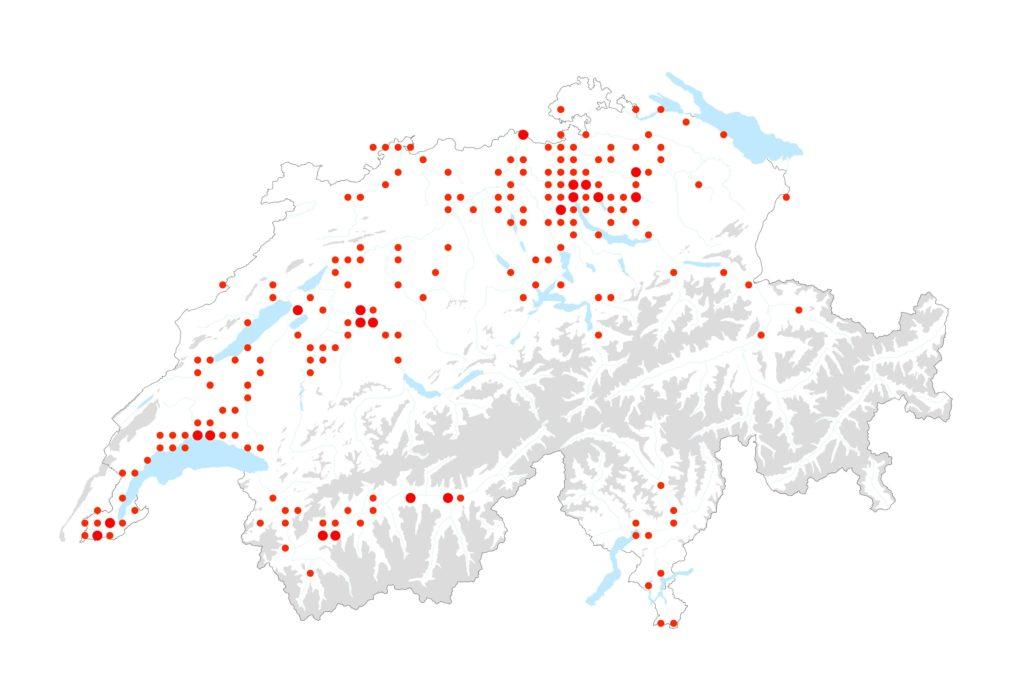 Asclepias syriaca, comunemente chiamata albero della seta o pianta dei pappagalli (figura 1), è una pianta perenne originaria del Nord America, considerata in Svizzera una specie invasiva e la cui coltivazione è vietata (Allegato 2.1 OEDA). Sebbene A. syriaca sia ancora relativamente rara nel nostro Paese, le segnalazioni su InfoFlora indicano che la pianta è presente da anni in focolai stabili e fertili sia in Ticino, sia a nord delle Alpi (figura 2). Negli ultimi anni è inoltre stato registrato un aumento delle segnalazioni di nuove popolazioni che attualmente sono ca. 200.