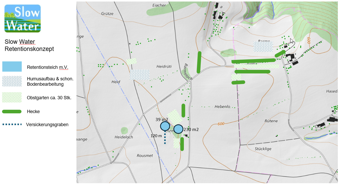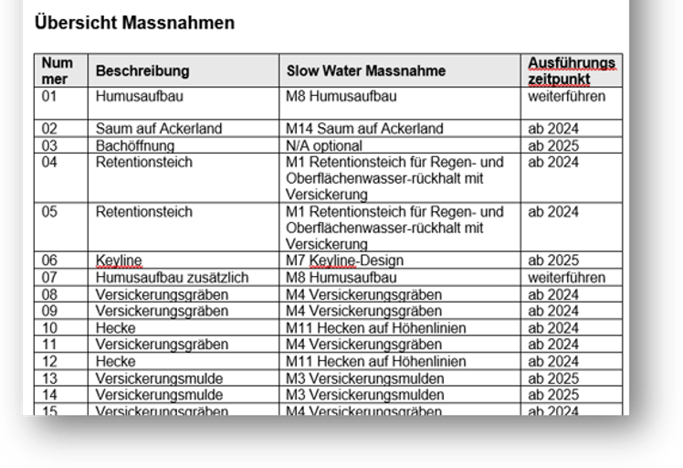 | Ziele Slow Water Projekt, Massnahmen, Prozess, Erwartungen, Entschädigungen | Hydrologische und agronomische Bestandesaufnahme (inkl. Entwässerungssysteme, Aufnahme Retentionspotential und Bedürfnisse, Berücksichtigung Naturgefahrenpotentiale, Gewässer- und Grundwasserschutzsituation sowie der Biodiversitätspotentiale), Festlegen der Ziele und Strategie | Massnahmen auf einer Karte Ansatzweise einzeichnen mit Legende, jedoch ohne präzise Verortung und Dimensionierung | In mehreren partizipativen Schritten und Diskussionen, wird die Retentionsstrategie mit Beteiligten überarbeitet. Weiterentwicklung durch Beratende und externe Fachpersonen. |