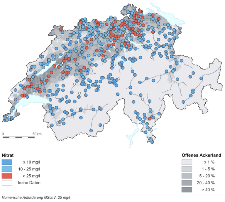 Stickstoffdünger, insbesondere in Form von Ammonium oder Harnstoff, wird im Boden von Mikroorganismen zu Nitrat (NO₃⁻) umgewandelt. Was für das Pflanzenwachstum notwendig ist, ist im Überschuss für das Trinkwasser schlecht. Hinzu kommt, dass Nitrat gut wasserlöslich ist und leicht ins Grundwasser ausgewaschen wird, wenn Pflanzen den Stickstoff nicht vollständig aufnehmen können. In der Schweiz wird der Grenzwert für Nitrat im Trinkwasser (25 mg/l) regelmässig überschritten, vor allem in intensiv bewirtschafteten Ackerbaugebieten wie dem Mittelland. Nicht nur im Grundwasser, auch in Oberflächengewässern ist zu viel Stickstoff problematisch. Nährstoffüberschüsse in Seen und Flüssen können zu Algenblüten und Sauerstoffmangel führen.