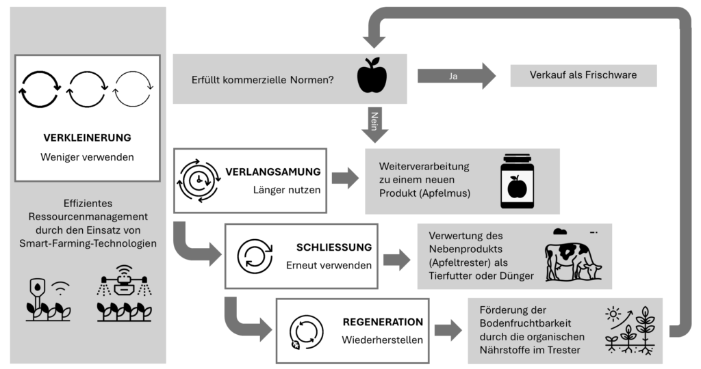 Die Prinzipien der Kreislaufwirtschaft lassen sich in der Land- und Ernährungswirtschaft anhand der vier vorhin genannten Strategien – Verkleinern, Verlangsamen, Schliessen und Regenerieren – besonders anschaulich verdeutlichen. Sie zeigen, wie sich zirkuläre Strategien entlang der gesamten Lebensmittelkette umsetzen lassen – von der landwirtschaftlichen Produktion über Verarbeitung und Handel bis hin zum Konsum.