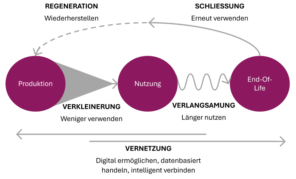 Im Gegensatz dazu verfolgt die zirkuläre Wirtschaft ein regeneratives und ressourcenschonendes Prinzip mit den folgenden Strategien (vgl. Abbildung):